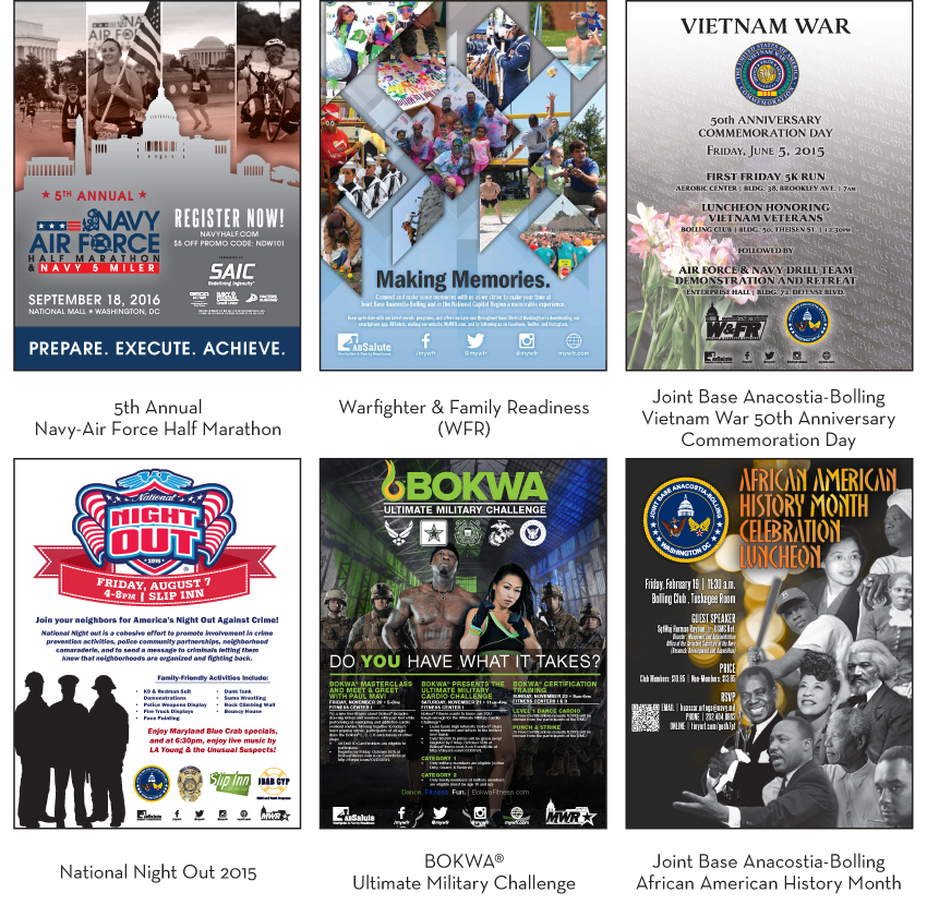 Joint Base Anacostia-Bolling (JBAB)'s MWR hosts dozens of special events each year, including the Navy-Air Force Half Marathon, which takes place every fall at the National Mall in the heart of Washington, DC. These special events, along with numerous regular ongoing programs and classes, benefit not only JBAB's military community, but also the Department of Defense and Government employees that work on the base. The following ads are just a small sampling of the various special events that are hosted by JBAB's MWR that attract people locally, nationally, and in some instances, internationally.